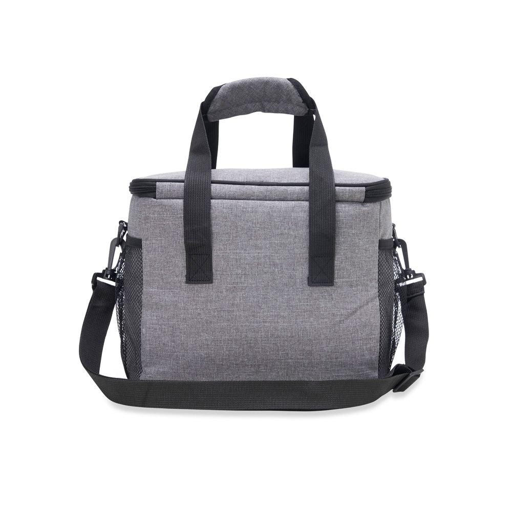 Bolsa térmica de nylon 14 litros com bolso frontal e bolsos laterais em malha. Compartimento principal com revestimento térmico soldado antivazamento e alças de mãos com suporte de juntura. Acompanha alça transversal.
