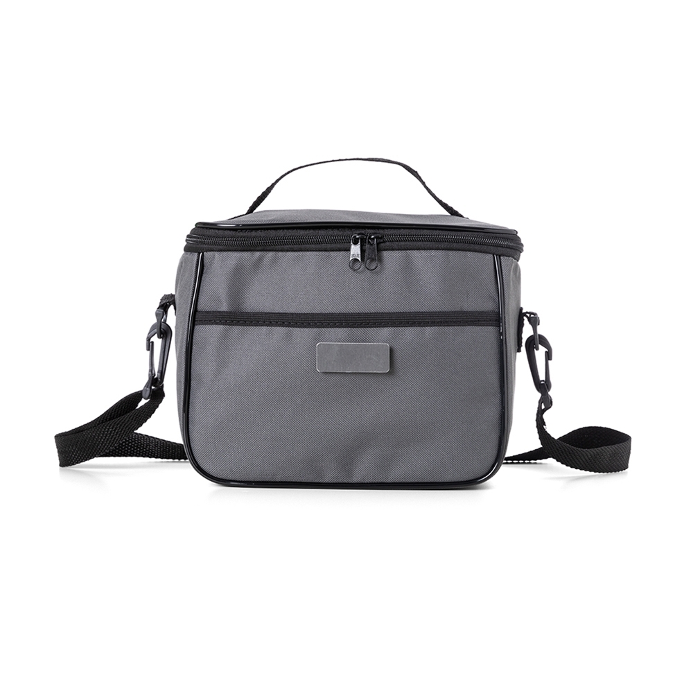 Bolsa térmica 6 litros com bolsos externos e alça de mão em nylon, contém bolso frontal aberto e bolso traseiro com zíper. Acompanha plaquinha metálica e alça transversal regulável com mosquetões para encaixe nas fivelas laterais da bolsa.