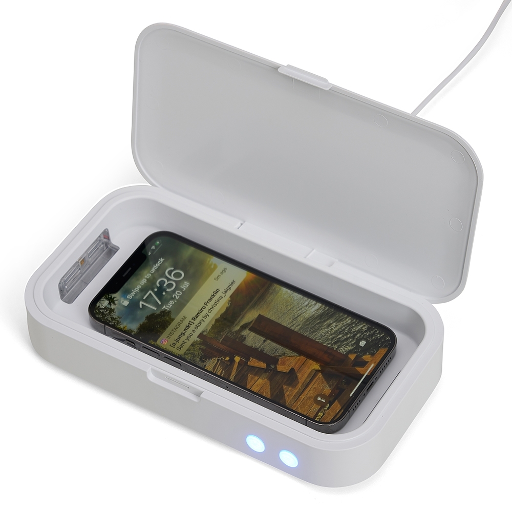 Caixa esterilizadora UV multifuncional. O produto esteriliza objetos através da exposição a luz UV-C, conhecida por eliminar 99% dos vírus e bactérias após um curto período de exposição. O produto também possui a função de aromaterapia, permitindo a utilização óleos essenciais a base de plantas (não inclusos) para aromatizar os objetos esterilizados. O produto também é um carregador wireless com tecnologia de indução, que carrega o seu dispositivo (compatível com tecnologia QI) enquanto realiza a esterilização. O produto acompanha: Pano para limpeza de superfícies, Cabo USB tipo C e Manual de instruções.