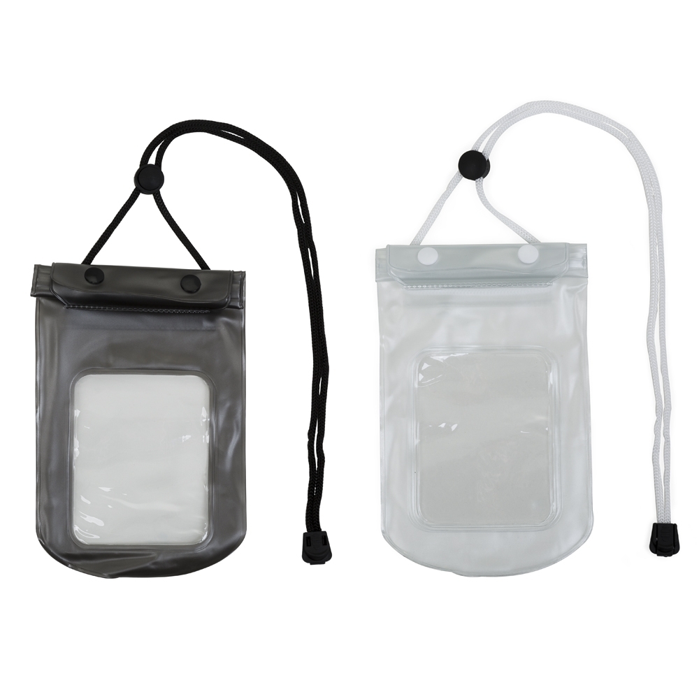 Case impermeável para smartphone, fechamento á vácuo e através de abotoamento, com cordão de nylon, fabricado em PVC.