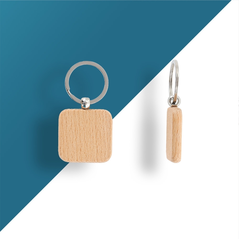 Chaveiro em madeira com formato quadrado.
