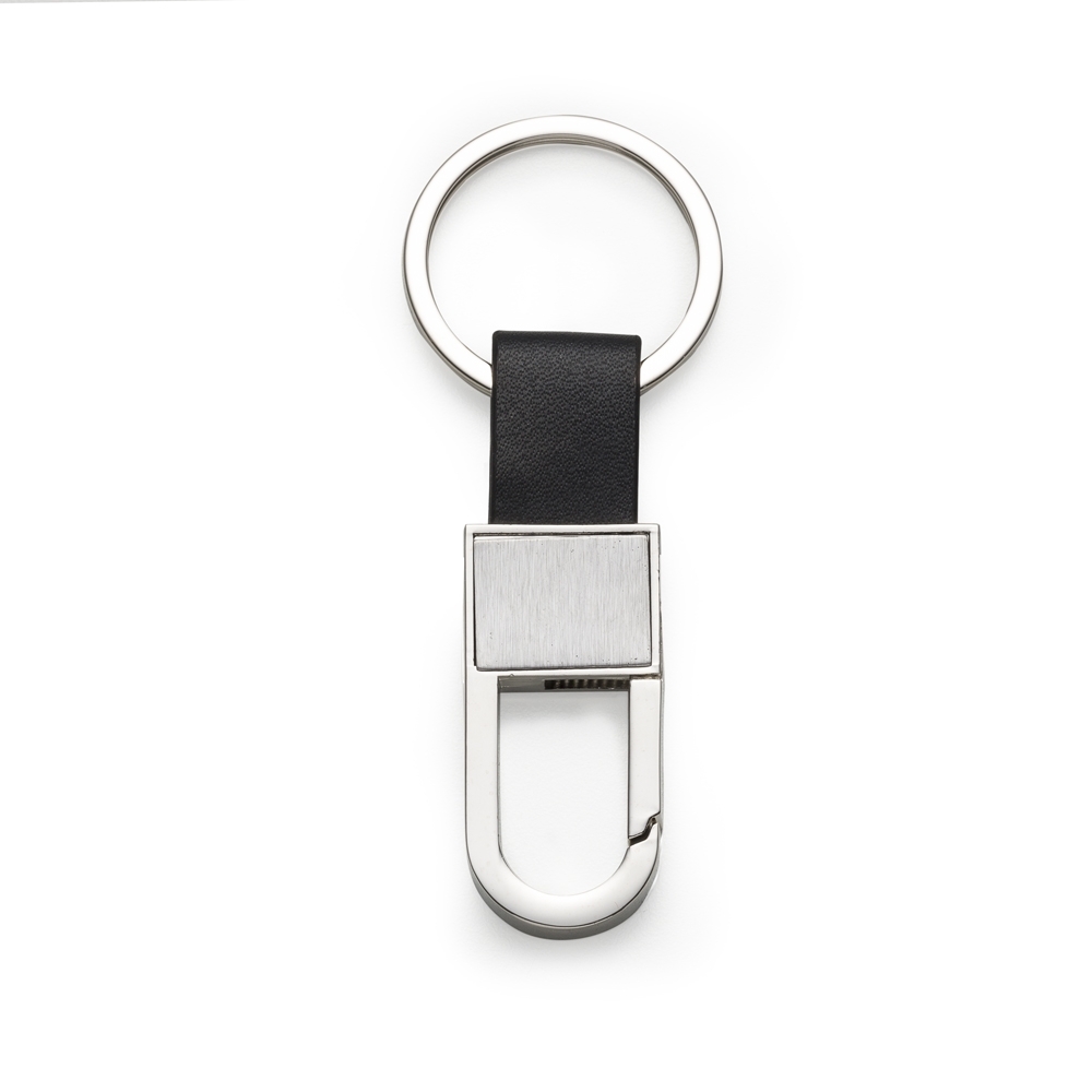 Chaveiro metal mosquetão(sem trava) com alça de couro sintético. Possui chapa frontal quadrada em inox e verso brilhante.