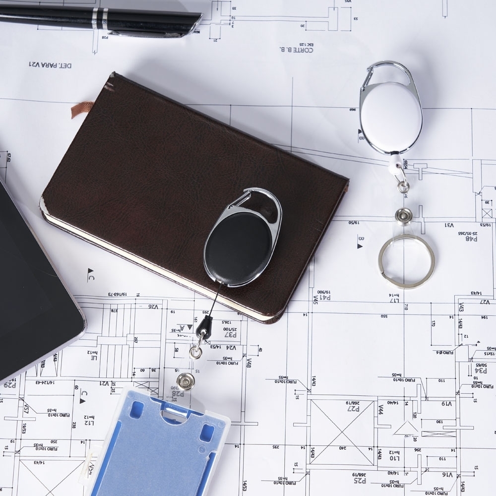 Chaveiro estilo mosquetão retrátil com porta crachá. Feito de metal e PVC. Acompanha argola em inox para chaveiro e suporte transparente para crachá com botão de pressão. Possui um clip atrás para pendurar.
