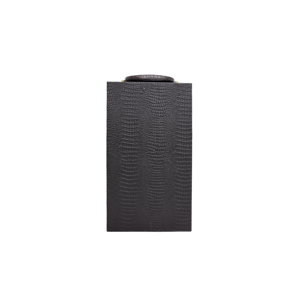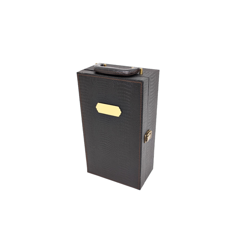 Kit vinho 4 peças em maleta de couro sintético texturizada. Contém saca-rolhas metálico, bico condutor com tampa, cortador de lacre e wine collar. Maleta com alça, trava de segurança e plaquinha metálica fixa. Área interna revestida de veludo com suportes de nylon com velcro e duas repartições para garrafas.