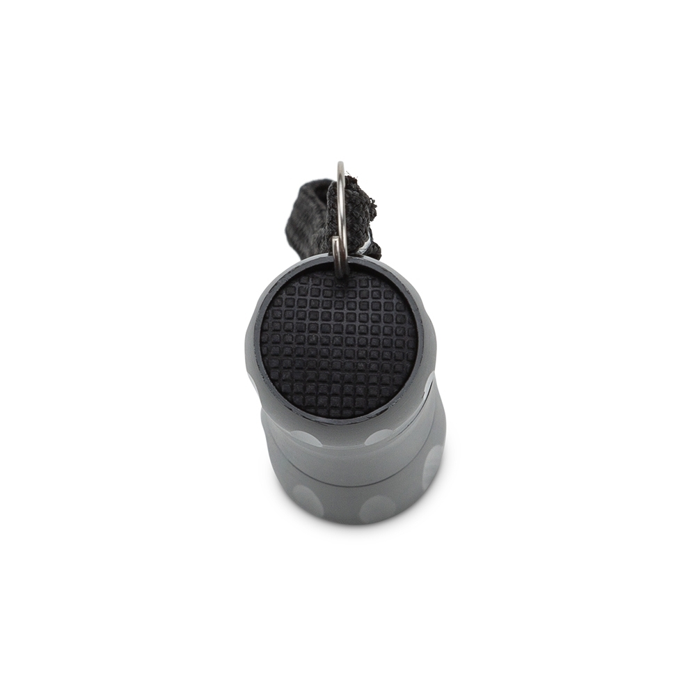 Lanterna de alumínio com alça. Possui um led acionado através do botão emborrachado e alça para transporte em nylon. Compartimento do botão desrosqueável para inserção de uma unidade de pilha AA(não inclusa).