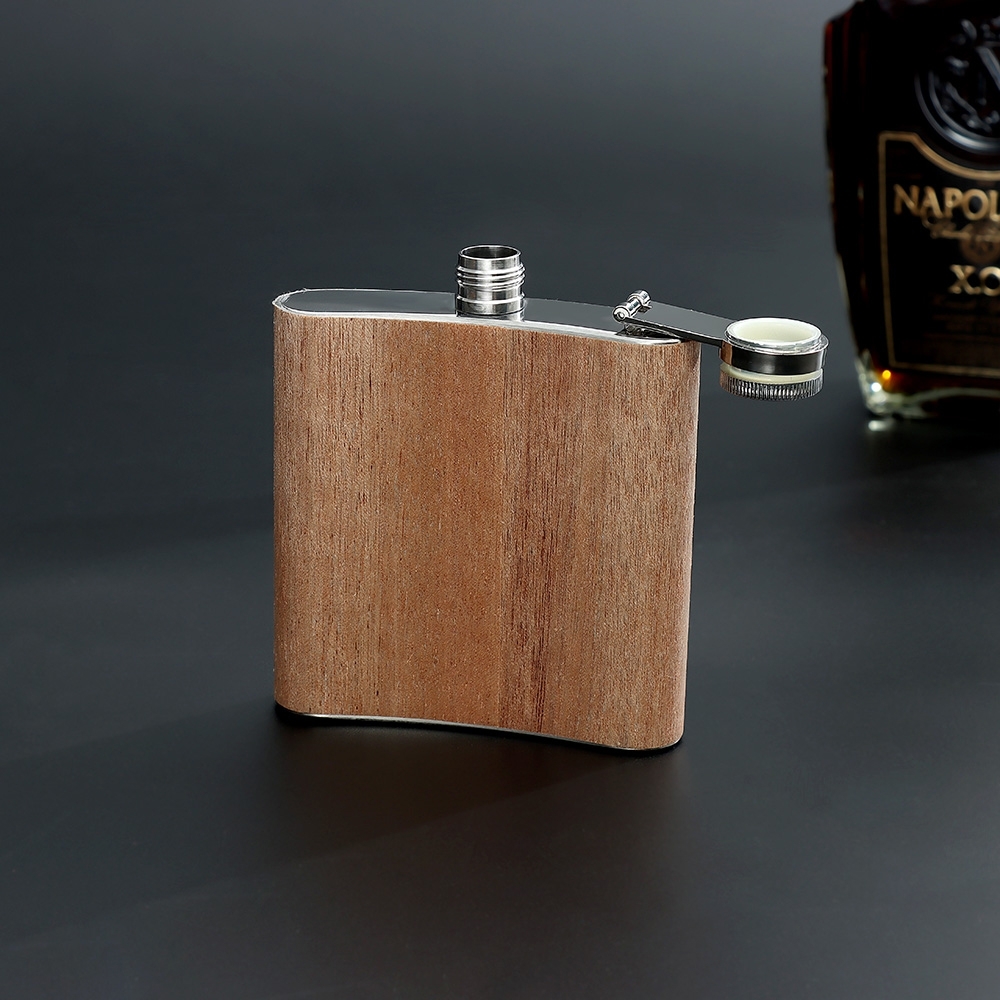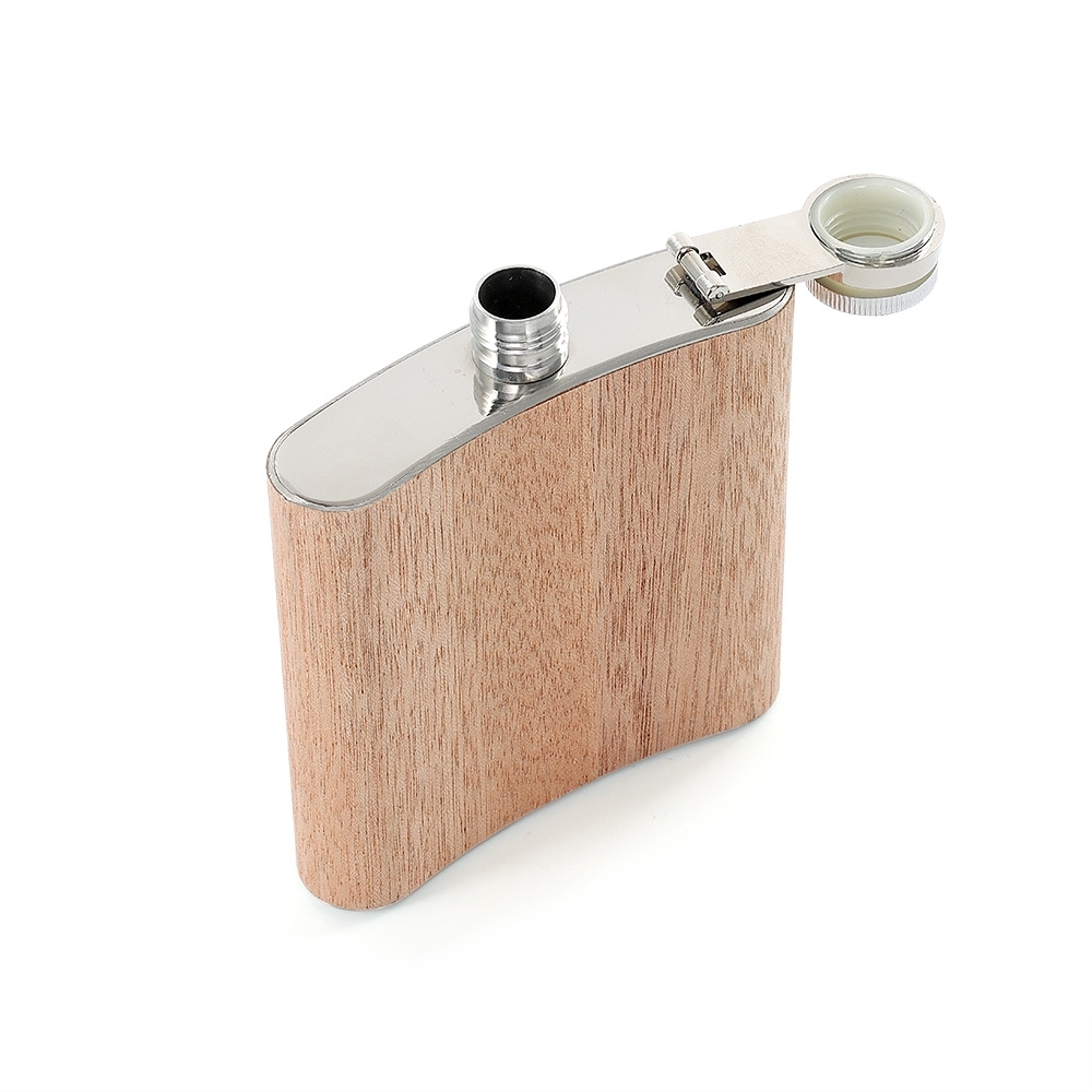Porta whisky 6oz em aço inoxidável com acabamento em folha de madeira.