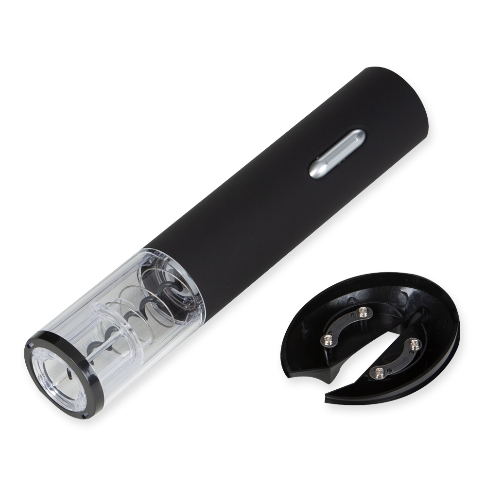 Saca-rolhas elétrico com suporte cortador de lacre, contém compartimento com tampa para inclusão de 4 pilhas AA (não acompanha). O suporte cortador de lacre também pode ser utilizado como base de sustentação.