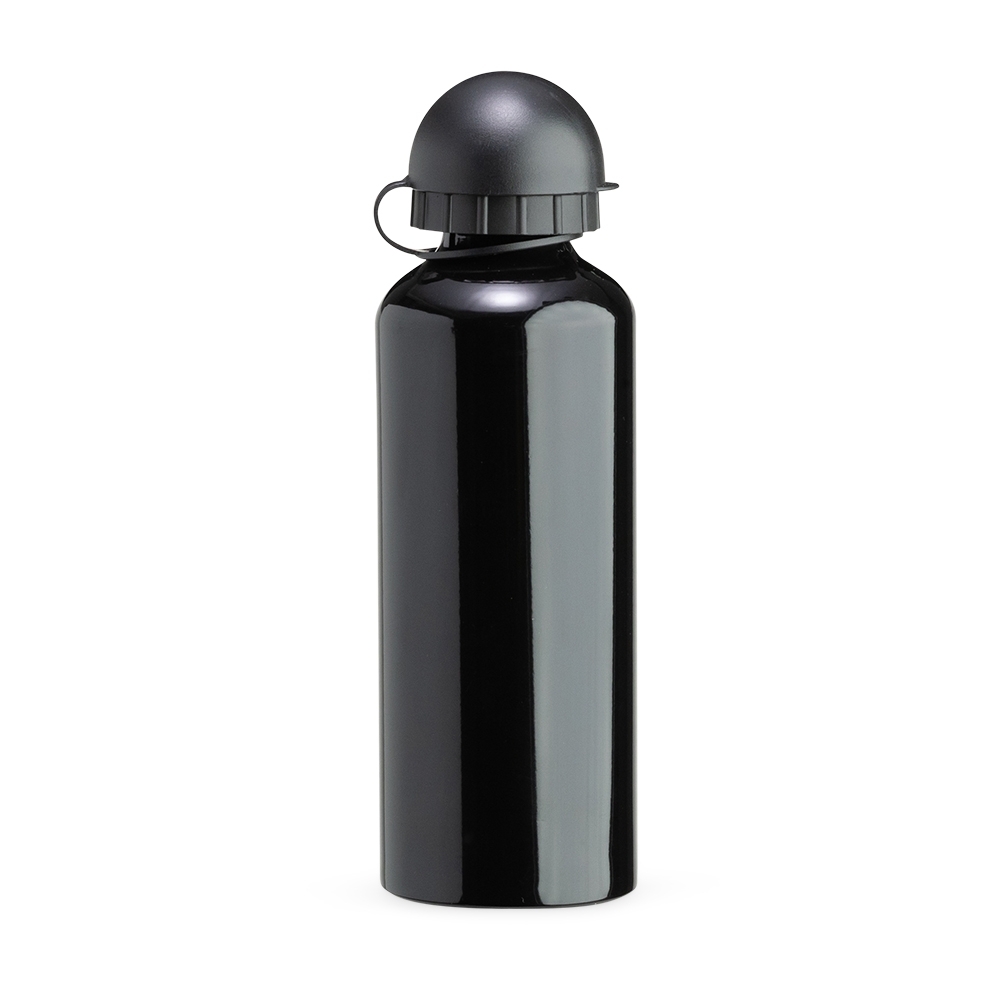 Squeeze 500ml de alumínio com pintura metalizada, tampa rosqueável e acompanha um segundo bico com mosquetão (não é térmico).
