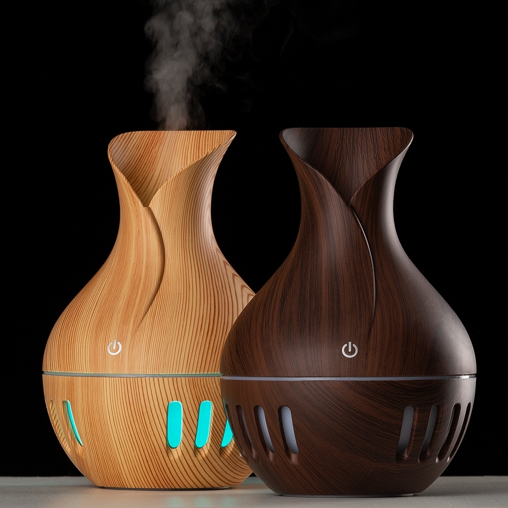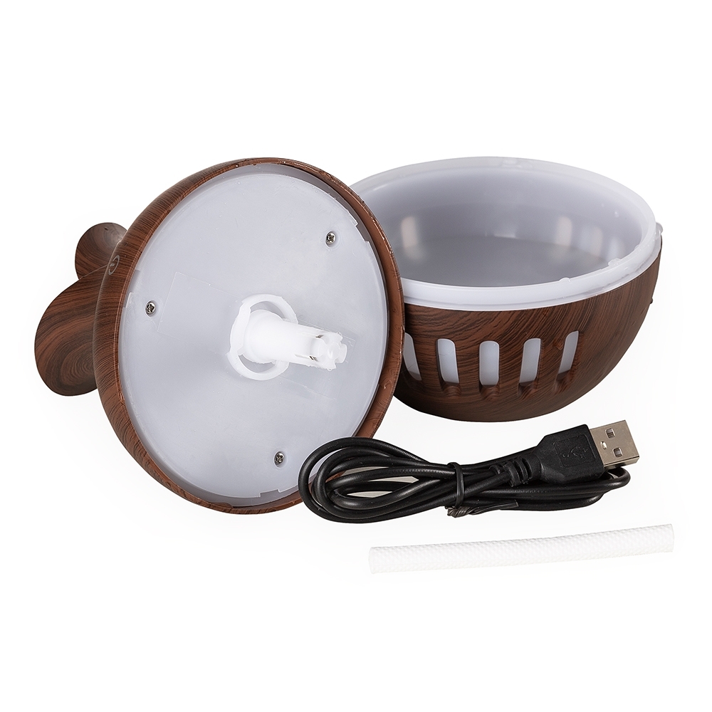 Umidificador ultrassônico com show de luzes em led. Produzido em material plástico com estilização similar a madeira, o umidificador possuí capacidade de até 130ml e funciona apenas a base de água. O produto não armazena carga, a sua utilização só pode ser feita com cabo USB. Taxa de consumo de <3W e taxa de tensão de DC5V. Acompanha refil de filtro de algodão e um cabo USB. Obs.: A limpeza externa do produto deve ser feita apenas com pano umedecido, caso submergir o produto o equipamento pode ser danificado. Obs.: Atenção, não devem ser utilizadas essências!